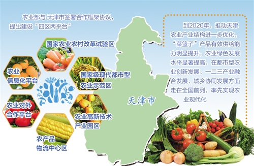 协议提出,到2020年,推动天津农业产业结构进一步优化,“菜篮子”产品有效供给能力明显提升,农业绿色发展水平显著提高,在都市型农业创新发展、一二三产业融合发展、城乡协同发展方面走在全国前列,率先实现农业现代化。