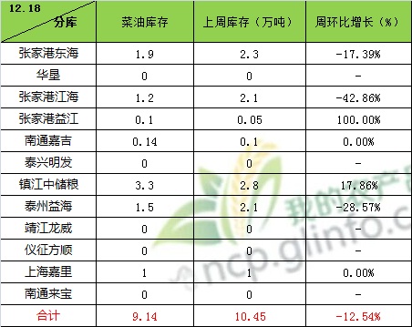 据我的农产品网监测显示,截止12月18日,华东地区菜油商业库存约为9.14万吨,较上周10.45万增加1.23万吨减幅12.54%。其中东海1.9万吨,靖江龙威零库存,泰州益海为1.5万吨,华垦零万吨,上海嘉里1万吨,中储粮3.3万吨,仪征方顺零万吨。
