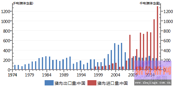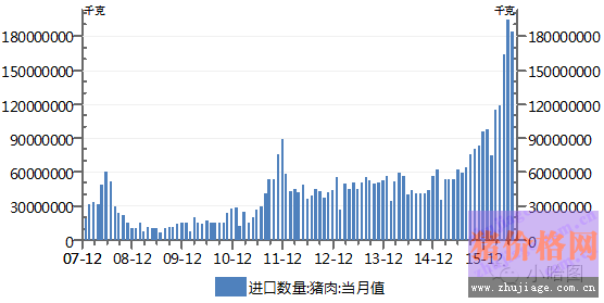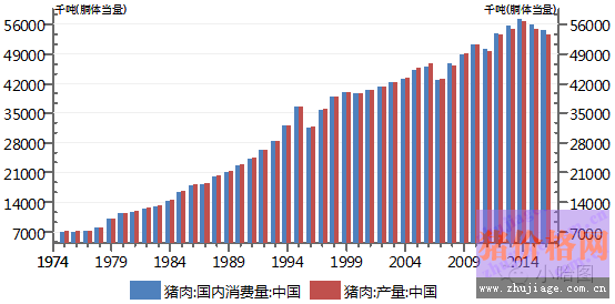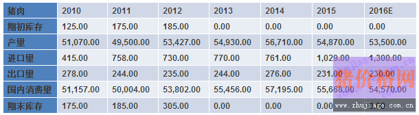 先来看看我国猪肉的供需情况,以便我们从整体上把握这头猪。在经历了14年的高峰之后猪肉产量和消费量都下行,2016年产量预计5350万吨,消费量预计5457万吨,但是进口量却增加,一定程度上弥补了国内的缺口,预计2016年猪肉进口将达130万吨。