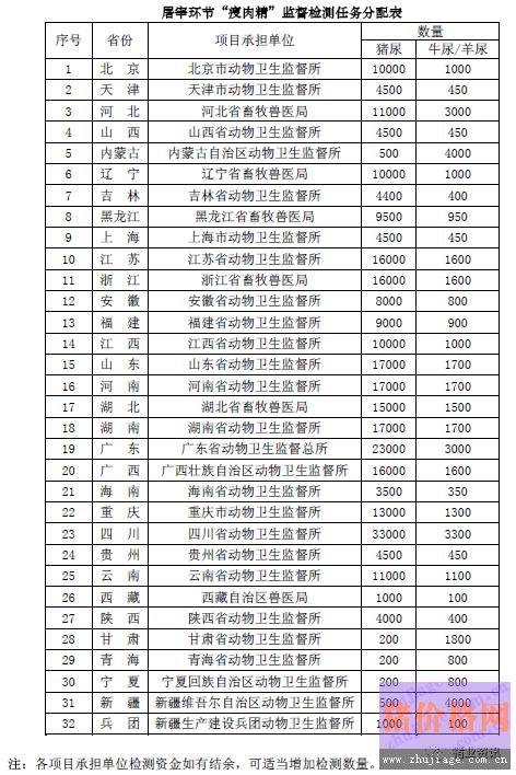 (一)屠宰环节“瘦肉精”监督检测工作由各省(自治区、直辖市)畜牧兽医主管部门组织项目承担单位具体实施。监督检测任务分配见附件1。