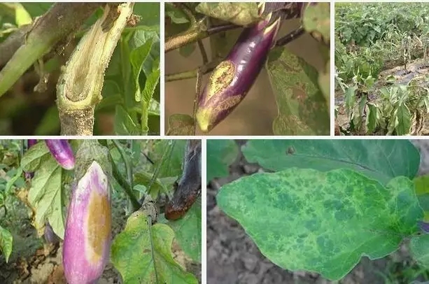 茄子绵疫病俗称“掉蛋”、“水烂”,是茄子主要病害之一。幼苗期发病,茎基部呈水浸状,发展很快,常引发猝倒,致使幼苗枯死。成株期叶片感病,产生水浸状不规则形病斑,具有明显的轮纹,但边缘不明显,褐色或紫褐色,潮湿时病斑上长出少量白霉。茎部受害呈水浸状缢缩,有时折断,并长有白霉。花器受侵染后,呈褐色腐烂。果实受害最重,开始出现水浸状圆形斑点,边线不明显,稍凹陷,黄褐色至黑褐色。病部果肉呈黑褐色腐烂状,在高湿条件下病部表面长有白色絮状菌丝,病果易脱落或干瘪收缩成僵果。
