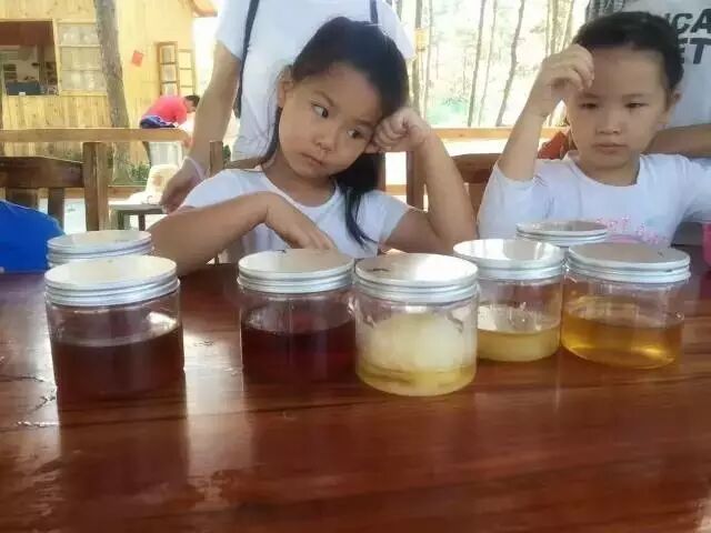先让每位小朋友和家长分别品尝真蜂蜜和假蜂蜜