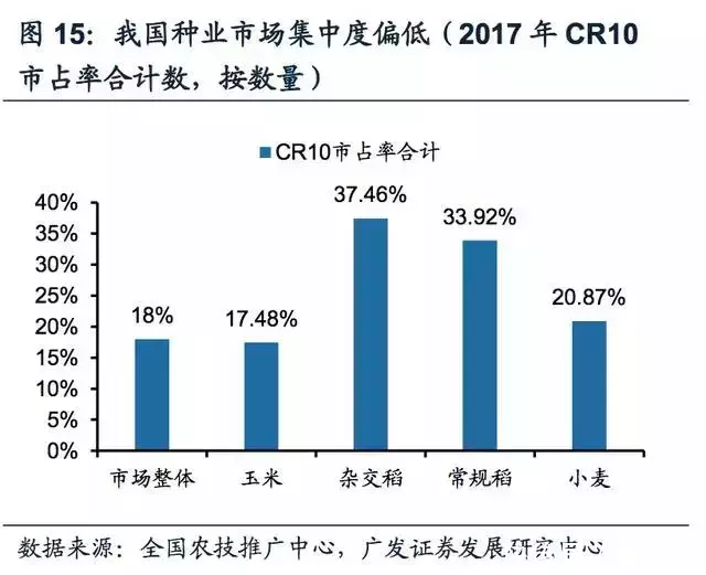 据全国农技推广中心的数据,2017年种业CR10(业务规模前十名的公司所占的市场份额)市占率18%,按作物分,水稻集中度较高,其中杂交稻37.46%,常规稻33.92%,但是和美国等发达国家70%-90%左右的市占率水平相比仍有待提高。