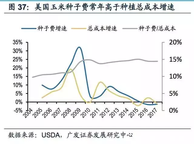 根据农业部的数据,中国人工和土地是驱动总成本常年增长的主要动力,与此相反,根据USDA的数据,美国种子费增速高于总成本,价格的稳定增长有效推动种子市场规模扩张。