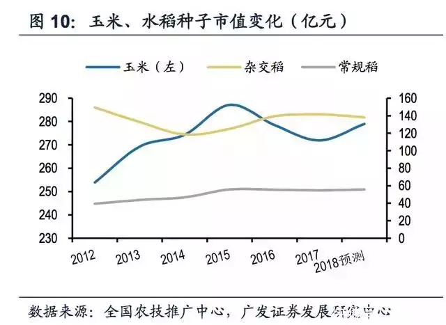 由于种植面积大,商品率较高,三大主粮种子占据我国商品种子市场的半壁江山,其中玉米种子市值规模最大,达279亿元,水稻种子194亿元(其中杂交稻139亿元、常规稻55亿元),小麦种子161亿元,分别占比22.7%、15.8%和13.11%。