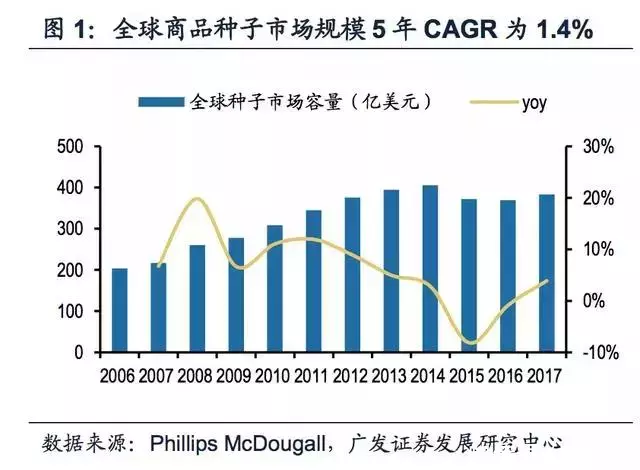 种子行业位于整个农业产业链的起点,是最重要的农业生产资料之一。根据PhillipsMcDougall数据,2017年全球主要国家商品种子市场规模约383亿美元,同比增加3.9%,行业5年CAGR(复合年均增长率)为1.4%,10年CAGR(复合年均增长率)为6.1%。
