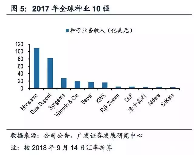2017年中国企业隆平高科首次进入全球10强,实现营收31.9亿元,全球市场份额不足1%。