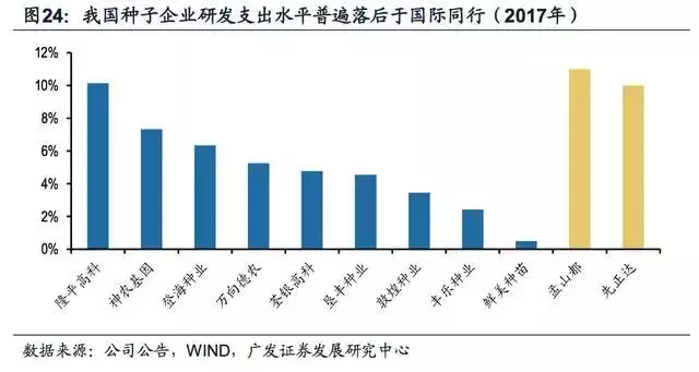 规模不足掣肘抗风险能力、注重营销,忽略研发则成为风险规避下的“最优解”。根据农业部数据,我国种子企业研发支出远落后于国际同行,2016年种子企业科研总投入为39.6亿元,占种子销售收入的5.3%,经统计,上市企业中,隆平高科研发支出水平最高,为10.1%,与国际同行相当,但是因规模限制,绝对水平上差距明显。