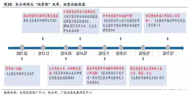 据农业部种子管理局估计,能参加试验的品种数量只占申请总量的1/5到1/3,自2014年起,农业部深化“放管服”改革,拓宽试验渠道,缓解参试矛盾,除保留了原有的国审和省(区)审外,额外增设绿色通道(2014)、良种攻关(2014)、联合试验体(2016)、特殊品种试验(2017),扩大试验容量,缩短试验周期。