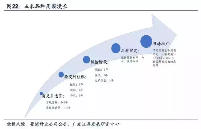 以玉米为例,根据登海种业公告,玉米育种周期可分为自交系选育、杂交种组配和试验3个阶段,其中,自交系选育在不同技术水平下存在差异,长则3-4年,短则1-2年,生物技术的应用可以大大缩短时间。