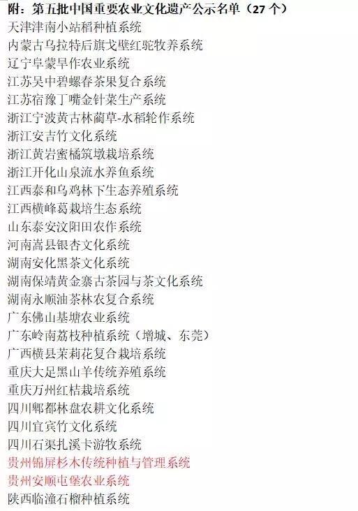 日前,农业农村部公布第五批中国重要农业文化遗产公示名单,贵州锦屏杉木传统种植与管理系统、贵州安顺屯堡农业系统等全国27项传统农业系统拟认定为第五批中国重要农业文化遗产,公示时间为:2019年12月31日至2020年1月6日。