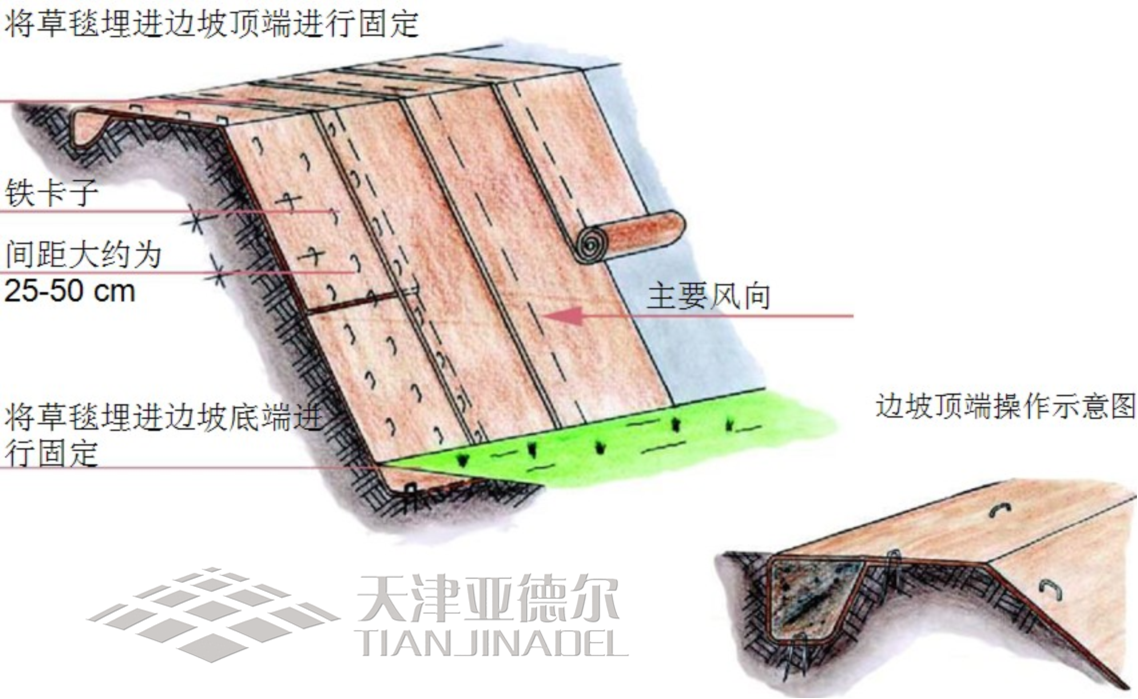 亚德尔生态集团与德国IGG公司合作,引进2条国际先进的植物纤维毯植被恢复技术和具有国际领先水平的生产线,日产量50000平米左右,主要以各种植物纤维材料(如稻秸、麦秸、玉米秆、棉秆、椰壳纤维、大麻、黄麻、亚麻、天然杂草)为原料,结合各种灌、草植物的合理配置,以及保水剂、营养基质的添加,生产多用途“植物纤维毯”。