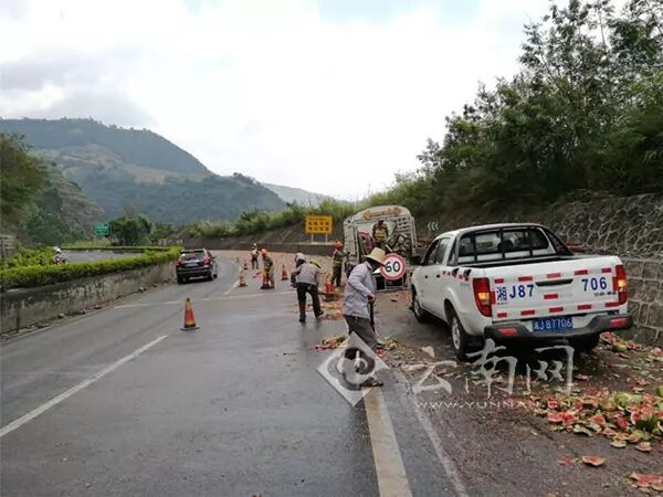 5月11日中午11点30分左右,昆磨高速公路墨江往玉溪方向27公里长下坡路段南溪加水站附近,一辆拉载西瓜的轻型货车发生刮擦事故,导致货车上的西瓜散落一路,被碾碎成渣。