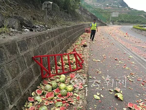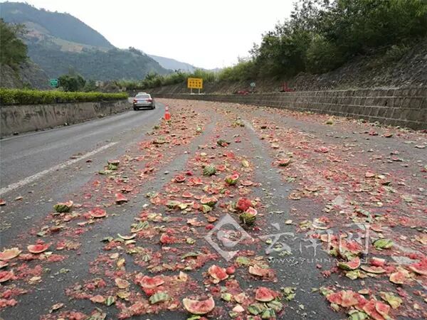5月11日,云南昆磨高速路上一辆拉载西瓜的货车发生事故,车上 2.5吨西瓜散落一路,被碾成渣。