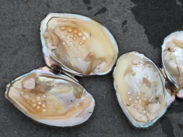 育珠蚌经过2夏1冬或3夏2冬养育后,即可采收。采珠一般在10月份到翌年2月份进行。秋冬季节当水温在15℃以下时,育珠蚌分泌珍珠质速度减慢,质细腻,光泽好。此时,又是植片季节,可以充分利用采珠后育珠蚌的外套膜制取小片进行植片手术。早春也可采珠,珠质同样较好,可以边采珠、边植片。采珠方法:把育珠蚌从竹架上拿下运到室内,用刀切断前后闭壳肌,用手指捏出外套膜内的珍珠。然后,及时洗涤。珍珠的洗涤,在饱和的食盐水中洗去粘液、珠囊和附着物,再用清水洗净珍珠上的盐水,最后再使用0.15%~0.2%十二醇硫酸钠洗涤,即将珍珠盛放在容器内,将药液淹没珍珠,轻搅拌3~5分钟,使药液和珍珠表面充分接触,静置过夜。第二天再轻轻搅拌约15分钟,用清水冲洗,把泡沫和污物彻底洗净,最后用绒布吸干,白绸布打光,分级出售。对光泽暗淡的珍珠,要用3%~5%的双氧水或稀盐酸浸渍,使其恢复光泽。经处理后光泽仍较差的珍珠,还可将它与混有食盐的锯木屑一同装入布袋中揉磨,即可增加光泽。