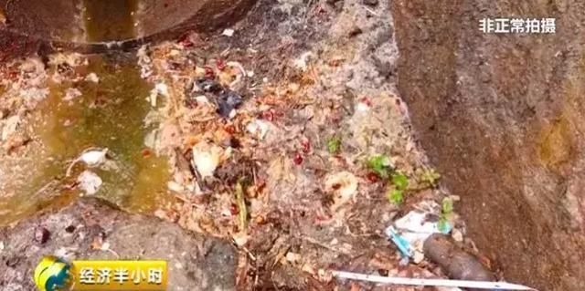 在沙址村前的一条水沟里,被倾倒了大量的餐厨垃圾,这里蚊蝇肆虐,发出一阵恶臭,通过墙体的痕迹、以及垃圾的厚度和颜色判断,在这里倾倒餐厨垃圾已经有很长时间。当地村民说,尽管有回收垃圾的地方,可是他们还是乱倒。
